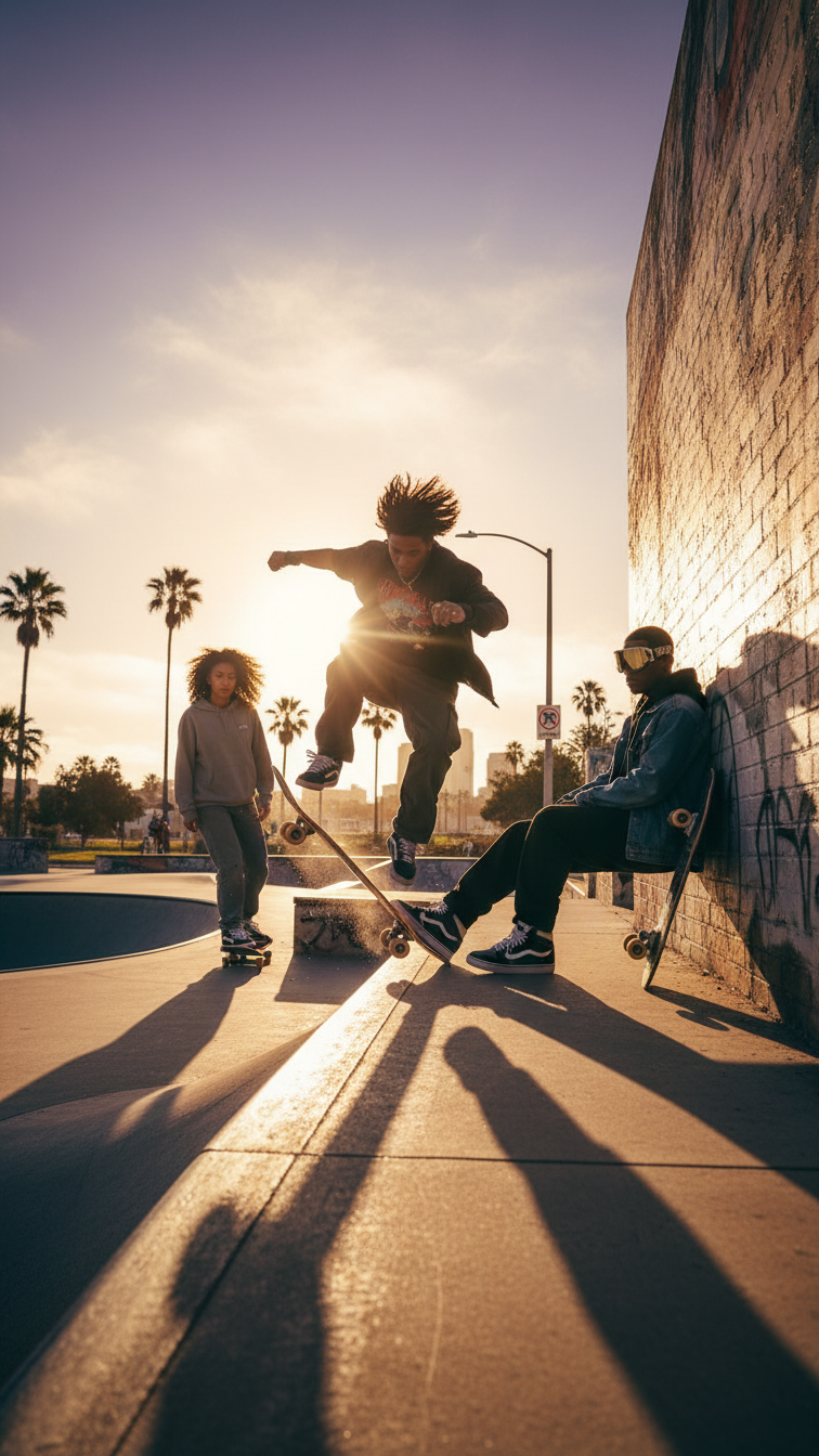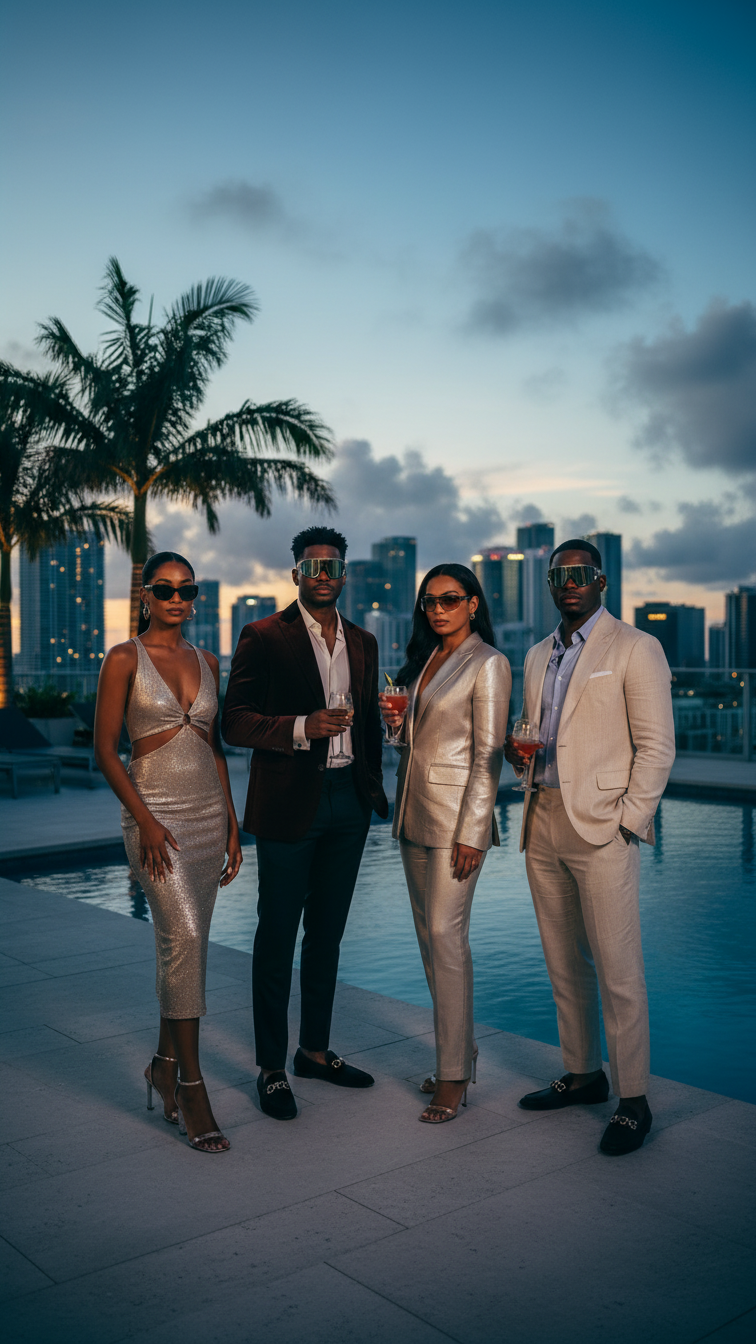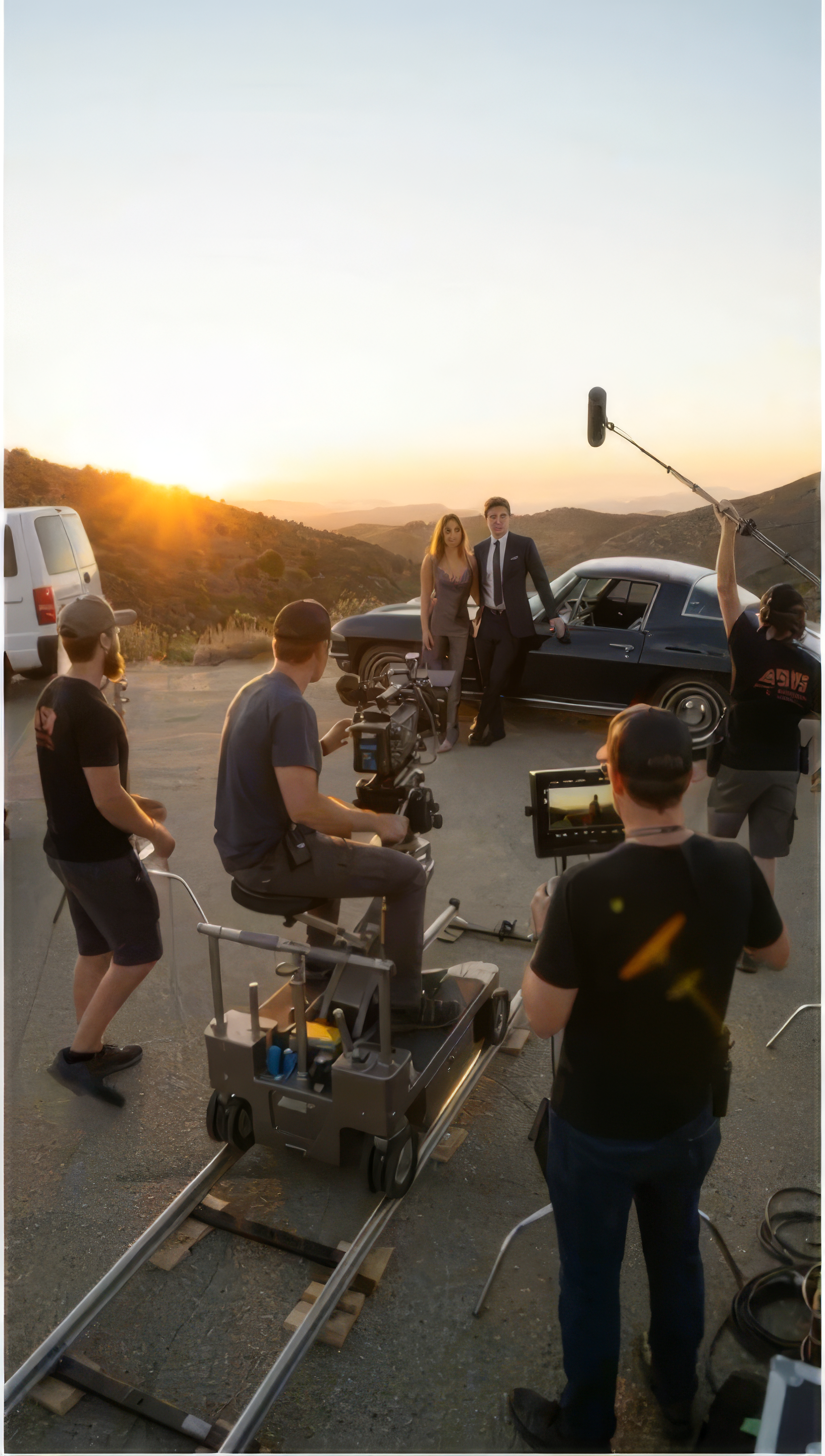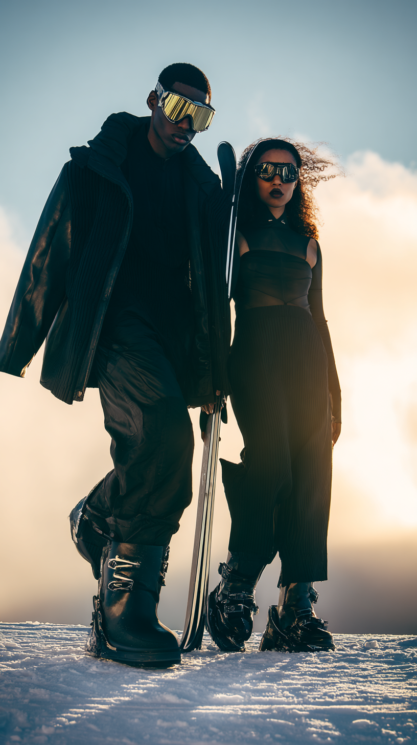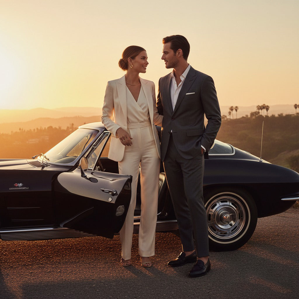 Tailored silhouettes, quiet confidence, and a classic icon—set against the warmth of the golden hour.