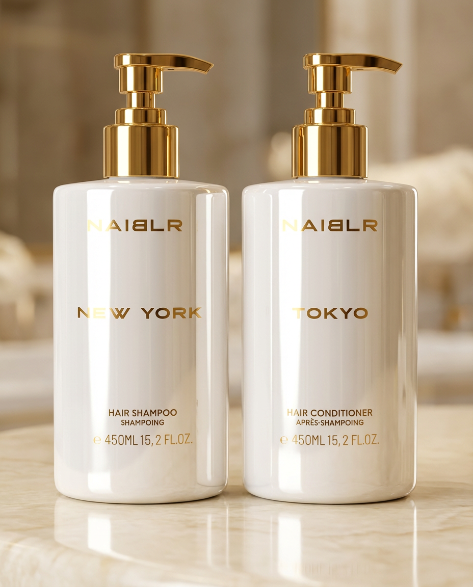 Sleek gold-accented bottles inspired by global cities, elevating everyday hair care into a luxurious ritual.